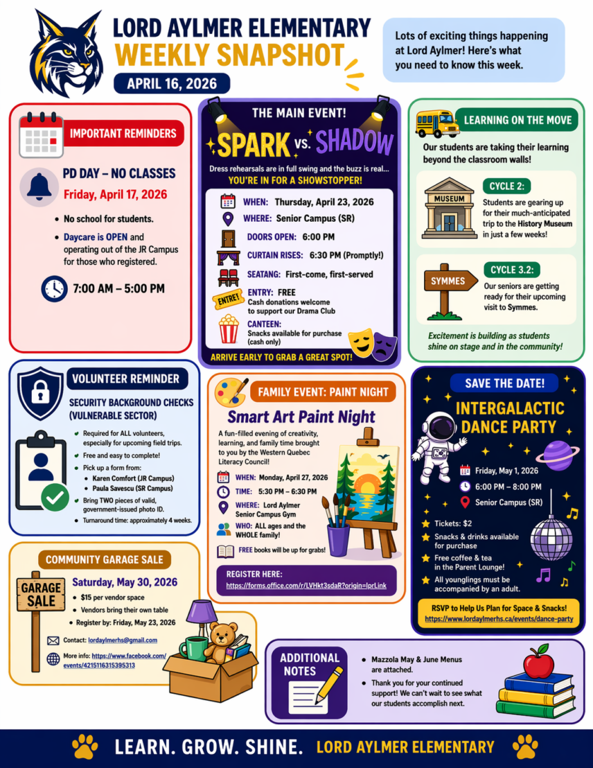 Hello, L.A. Families! While it’s been another short week, don’t let the quiet fool you, we are officially heading into a high-energy stretch with a calendar full of excitement. The sun is out (sometimes), the weather is warming up, and the halls are buzzing with anticipation for everything we have planned to close out April. REMINDER: Tomorrow, April 17, 2026, is a PD Day. The Main Event: Spark vs. Shadow Mark your calendars for next Thursday, April 23, 2026, because the BIG EVENT is finally here! Spark vs. Shadow is taking center stage, and the buzz is real. Dress rehearsals are currently in full swing, and if the “raving reviews” from behind the scenes are any indication, you are in for an absolute showstopper. Learning on the Move Our students are also preparing to take their learning beyond the classroom walls: There is a palpable sense of excitement in the air as we move into this final stretch of the month. Whether it’s on the stage or out in the community, our students are shining. Please see below and attached for this week’s update: REMINDER: Security Background Checks – Vulnerable Sector REMINDER: Paint Night @ L.A. 🎨 Mazzola – May & June Menu News from Home & School SAVE THE DATE – Intergalactic Dance Party• Put on your best Jedi robes and join us for our Intergalactic Dance Party on May 1, 2026 from 6:00 – 8:00 PM at Lord Aylmer Senior Campus!• Tickets are $2. Snacks and drinks will be available for purchase.• All