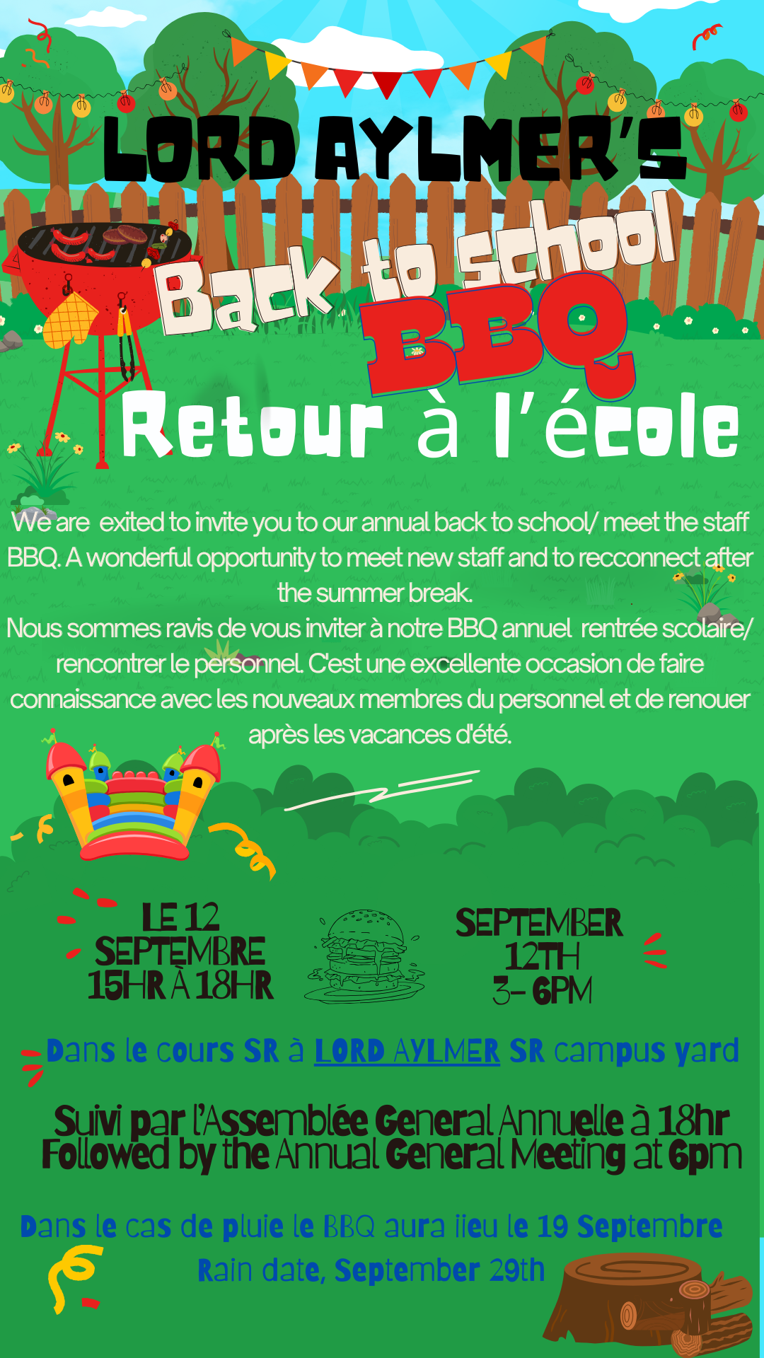 - Lord Aylmer will be hosting a Welcome Back BBQ/Carnival on Thursday, September 12th, 2024, from 3:00pm – 6:00pm at our SR campus. Please stay tuned for more details and confirmation.