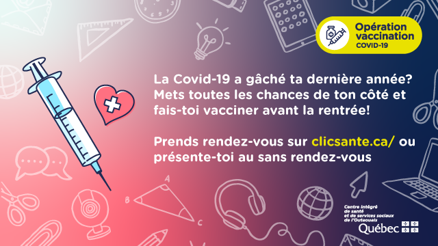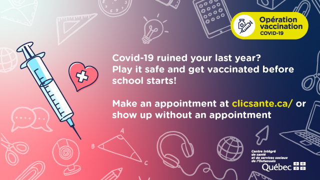 Covid-19 ruined your last year? Play it safe and get vaccinated before school starts! Make an appointment at clicsante.ca/ or show up without an appointment.