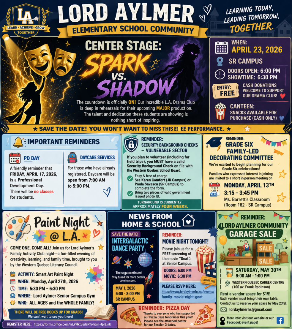 - We are excited to announce that our always popular Intergalactic Dance Party will be on May 1, 2026, from 6:00 – 8:00 PM at Lord Aylmer Senior Campus!